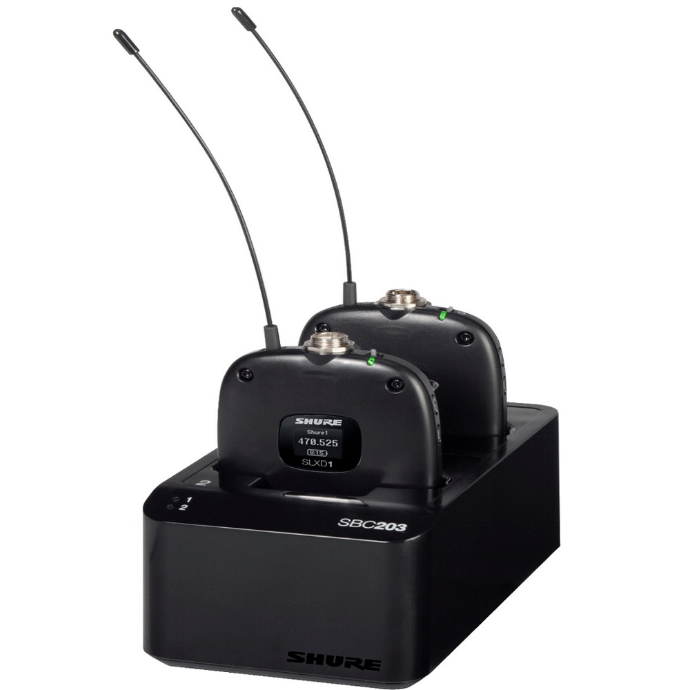 O carregador duplo Shure SBC203 permite o carregamento de até duas baterias de íon-lítio SB903 dentro ou fora de seus respectivos transmissores. Desenvolvido para carregar duas baterias, dois transmissores body pack, dois transmissores de mão ou qualquer combinação de dois transmissores SLX-D ou baterias SB903.
