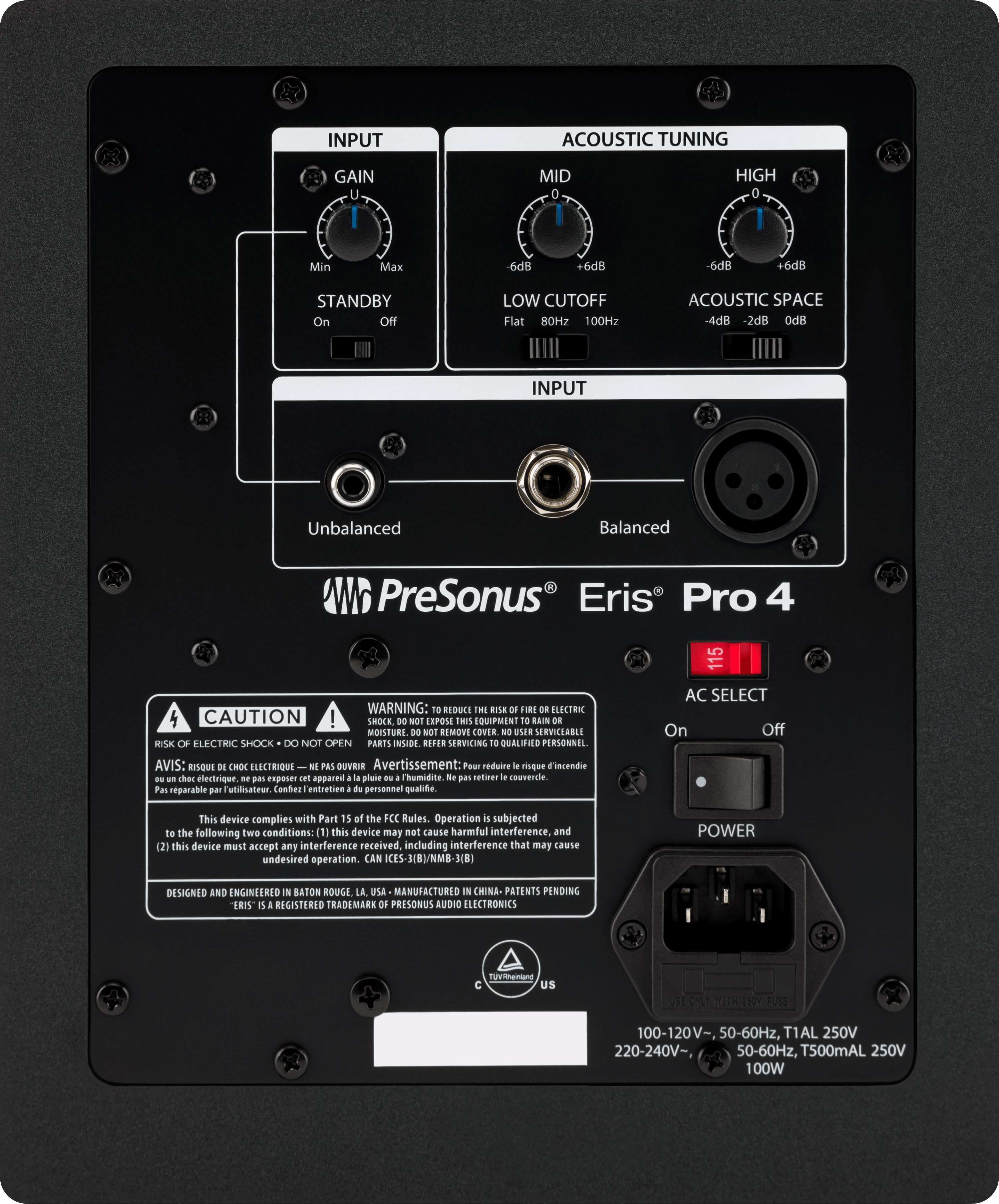 Os controles de ajuste acústico permitem que você configure o Eris Pro 4 para sua sala e o ajuste de espaço acústico de três vias pode compensar os efeitos do posicionamento do alto-falante contra uma parede ou em um canto. Opções de entrada flexíveis permitem que você conecte quase qualquer fonte de nível de linha, de mixers a interfaces de áudio e muito mais. Você não terá problemas para conectar seus alto-falantes Eris a praticamente qualquer coisa.