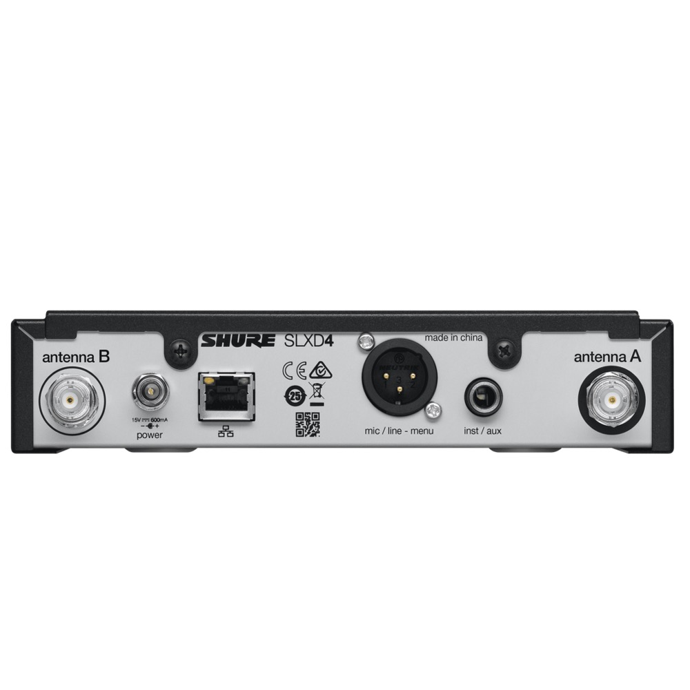 O receptor SLXD4 montado em rack, todo em metal, possui uma interface LCD intuitiva com medidores de RF, status da bateria e saída de áudio. Ele também oferece 60 dB de controle de ganho e saídas de instrumento XLR de mic / linha e 1/4 ". Recursos adicionais incluem varredura automática de frequência e sincronização de infravermelho para conectar facilmente o transmissor e o receptor à mesma frequência.